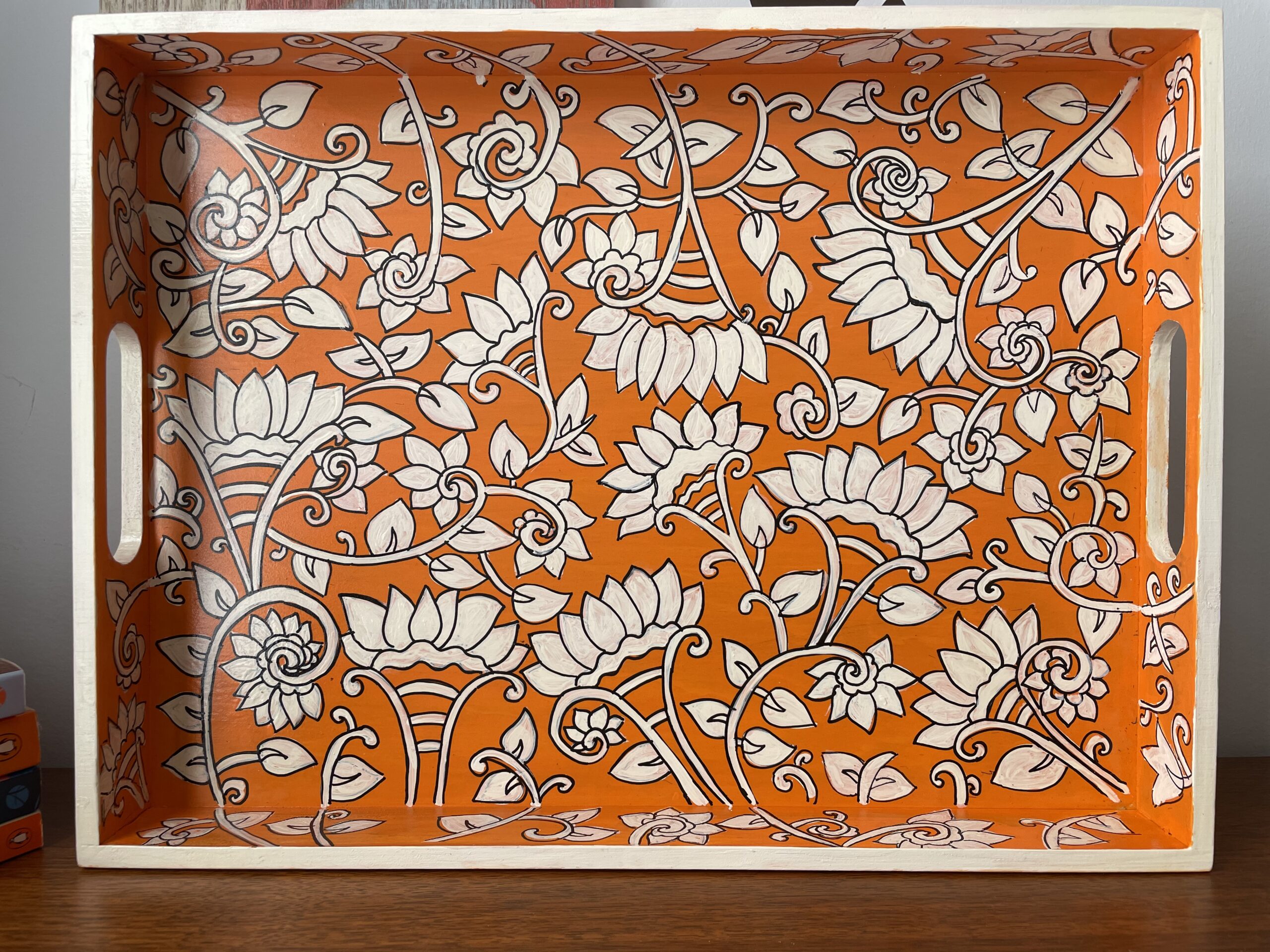 This rectangular,handpainted wood tray is ideal for serving snacks or pretty much anything. It can also serve as a centerpiece on a coffee table in your home or office. Available in three sizes .